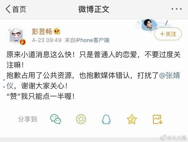 没过多久,彭昱畅也大方承认了恋情,不过女方大概率应该不是张静仪啦~(暗中期待着有新消息)