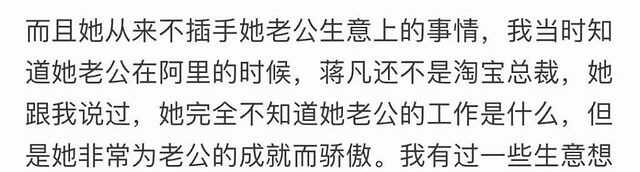 花花董花花的朋友有爆料:“她从来不插手老公生意上的事情,在蒋凡还不是阿里总裁时,她完全不知道老公的工作是什么,但她非常为老公的成就而骄傲。“