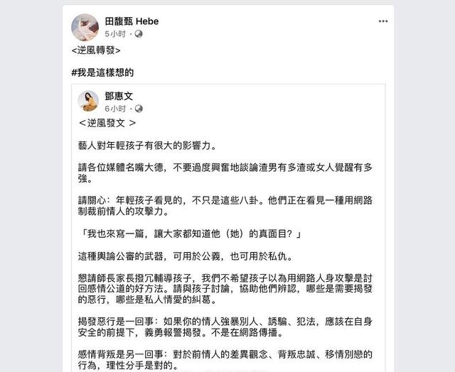 4月24日,田馥甄转发了一篇逆风而行的长篇文章,并表示他是这样认为的。文章的主要内容是分析艺术家对幼儿的影响有多大。其中一些言论与当前的罗志祥事件高度一致。