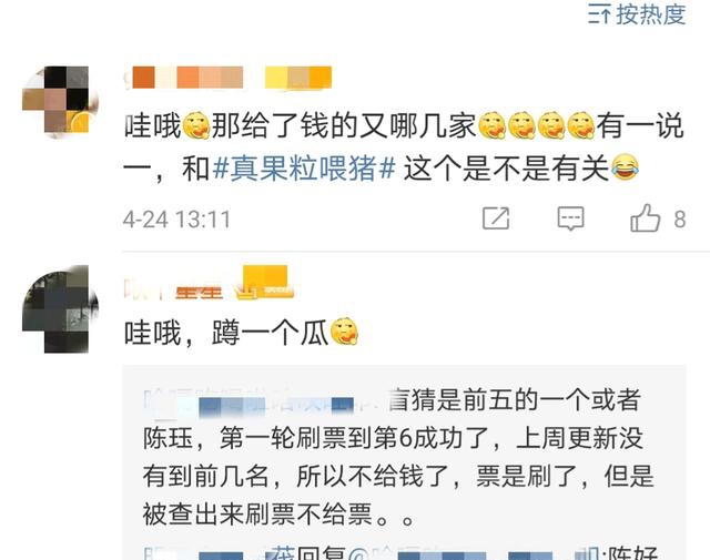 一些网民有合理的理由说这可能是陈珏。“在第一轮,她达到了第六名,但这一次她排名下滑。她上周没有到达最初的几个地方,所以她没有给钱。票被刷掉了,但发现她没有给钱。”这种补脑也不得不佩服网民的大脑。