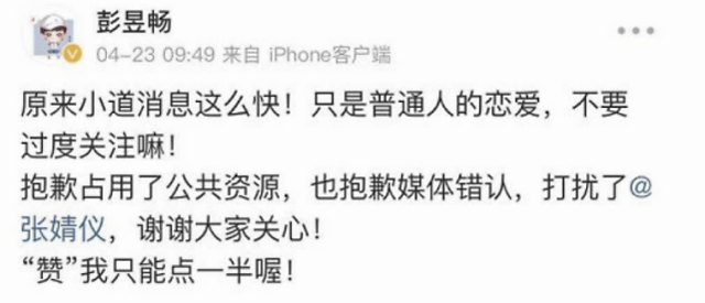 后来,彭宇昌在微博上对此事做出回应,并慷慨地承认自己恋爱了。然而,她说这个女人不是张静怡,而是一个局外人。每个人都因为占用公共资源和扰乱张静怡而感到错误和抱歉。接吻场景的安排似乎又要推迟了。