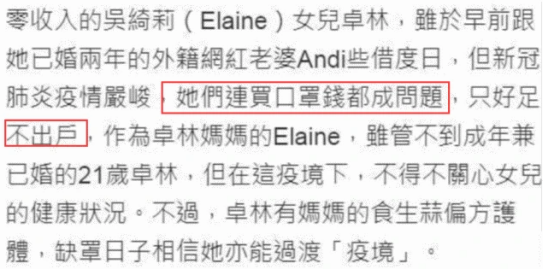 随着时间的推移,如今她们二人的经济状况并没有好转,甚至已经沦落到了需要借钱度日的地步。据悉,吴卓林在新冠肺炎肆虐的这段时间里,连购买足够的口罩都成问题,只能够待在家中,或者使用一些大蒜来进行化学防护。