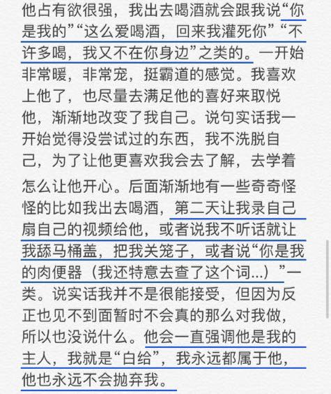 黎梵文中还表示,屈楚萧占有欲很强,以至于她怀疑自己被pua。每当黎梵出去玩的时候,屈楚萧总会对她生气,说“你是我的”、“这么爱喝酒,回来我灌死你”等等。还要她舔马桶,甚至直接称她是“肉便器”,把她关笼子。与此同时不停强调自己是黎梵的主人,黎梵就是“白给”,她永远属于他,他也永远不会抛弃黎梵。