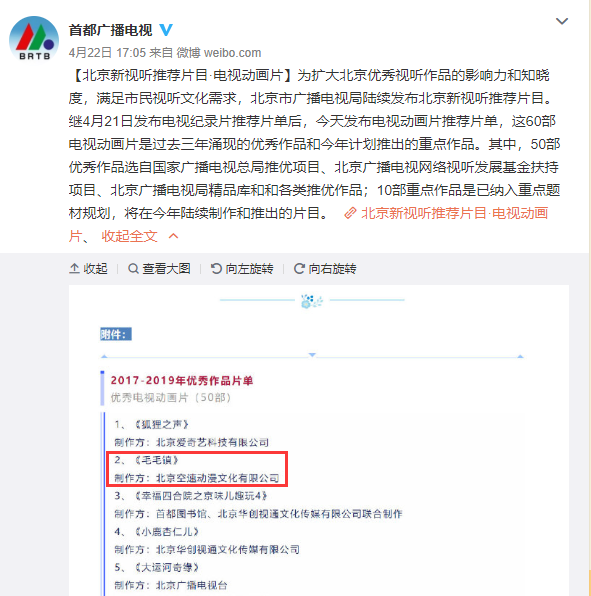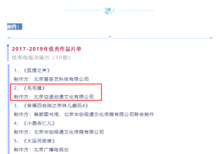4月22日,北京市广播电视局发布电视动画片推荐片单,共60部作品入选。儿童环保题材绘本风动画《毛毛镇》就在其
