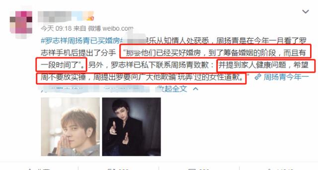 之后有媒体称从知情人处获悉,罗志祥与周扬青是今年一月份分手,而此前两人已经买好了婚房,筹备起了结婚事宜。该知情人也称罗志祥私下已经联系过周扬青并向对方致歉,但周扬青就提出让罗志祥向广大被他欺骗、“玩弄”过的女性道歉。如果真如知情人所说,那么罗志祥第二波道歉也是诚意欠缺呀!