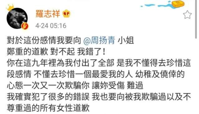 24日凌晨五点多,罗志祥突然再次发文向周扬青道歉,还间接承认了周扬青的各种爆料,彻底坐实“渣男身份”。