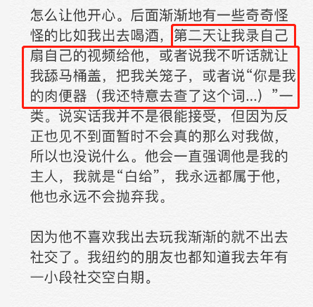 女生在交往过程中感觉到了屈楚萧的强势,屈楚萧在女生出去喝酒的第二天,让女生录制一段自己扇自己耳光的视频,或者不听话让女生舔马桶盖,还要把女生关到笼子里,总之这些方式残忍又让人觉得恶心。