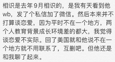 屈楚萧前女友在长文中写道,与屈楚萧在2019年9月相识,之后互相加了联系方式,但是并没有谈恋爱。在女方决定回美国之后与屈楚萧断联之后,屈楚萧依旧与女方联系。