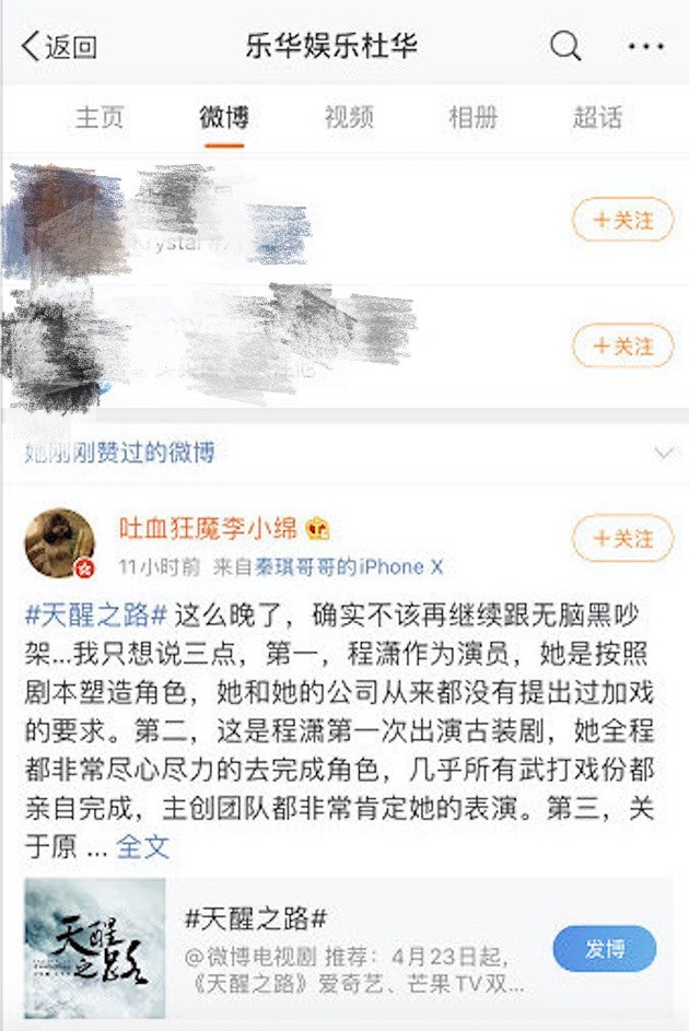 24日凌晨,《天醒之路》编剧在微博发文否认此事,力挺程潇。随后,程潇经纪公司老板杜华点赞,表示赞同。