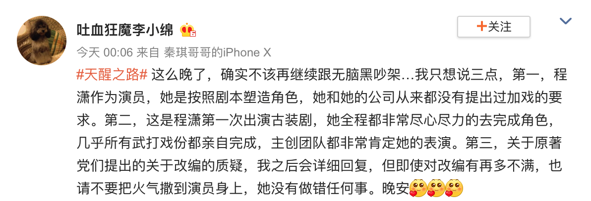 《天醒之路》编剧提出了三点,表示:“第一,程潇作为演员,她是按照剧本塑造角色,她和她的公司从来都没有提出过加戏的要求。第二,这是程潇第一次出演古装剧,她全程都非常尽心尽力的去完成角色,几乎所有武打戏份都亲自完成,主创团队都非常肯定她的表演。第三,关于原著党们提出的关于改编的质疑,我之后会详细回复,但即使对改编有再多不满,也请不要把火气撒到演员身上,她没有做错任何事。”