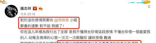 此外,罗志祥还私下联系周扬青道歉,只希望她不要放石锤,周扬青听后则希望他向欺骗过的女生道歉。而罗志祥也确实在24日凌晨发表了道歉声明,默认了一切。