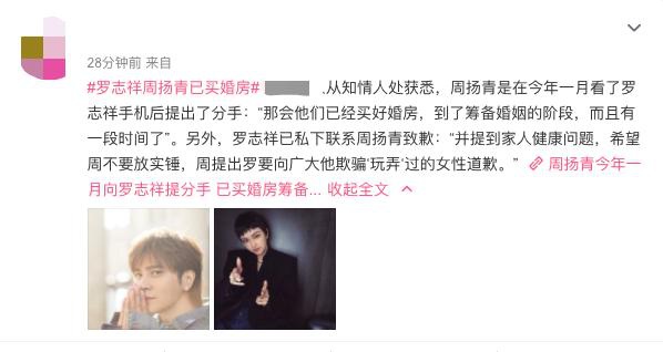 24日一早,有媒体爆料,称知情人透露,周扬青是在2020年1月向罗志祥提出分手的。那时他们已经买好了婚房,到了筹备婚姻的阶段,而且已经有一段时间了。