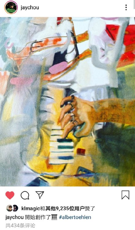 4月23日,周杰伦在社交平台上晒出一组照片,照片中他悠闲地坐在一幅音乐主题画作前面赏画。周杰伦配文:“下雨天最适合看书喝咖啡,当然还要有音乐,现场如果没音乐,书里面至少也要有”。
