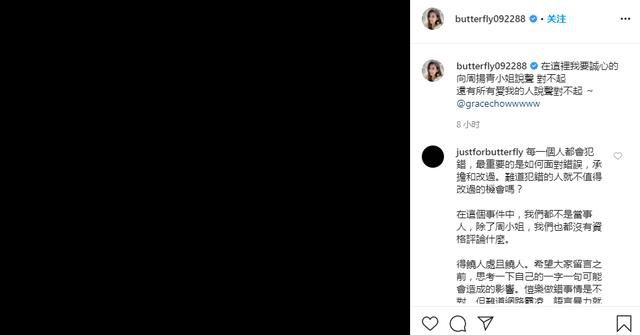 25日晚,蝴蝶修女向周扬青道歉,这相当于承认她确实和罗志祥有关系。即使她在晚上的这个时候发表了一篇文章,她已经在几个小时内收到了数万条评论。