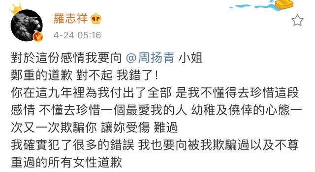 分手后,罗志祥也发表了深夜道歉。它确实是一个时间管理器。他在深夜向周扬青和其他他不尊重的女性发表了特别道歉。他选择在早上5点发送。除了证明他真的熬夜赢得冠军,每个人都猜测周扬青手中还有更多的材料。罗志祥不敢冒犯,只能屈服。