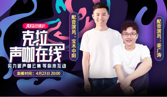 4月23日,国内知名配音演员蒋光涛、包慕忠在克拉拉乐买现场直播,帮助开展“克拉拉声咖啡馆在线——世界读书日”特别活动,与粉丝分享生活,互动问答,通过声音传递图书力