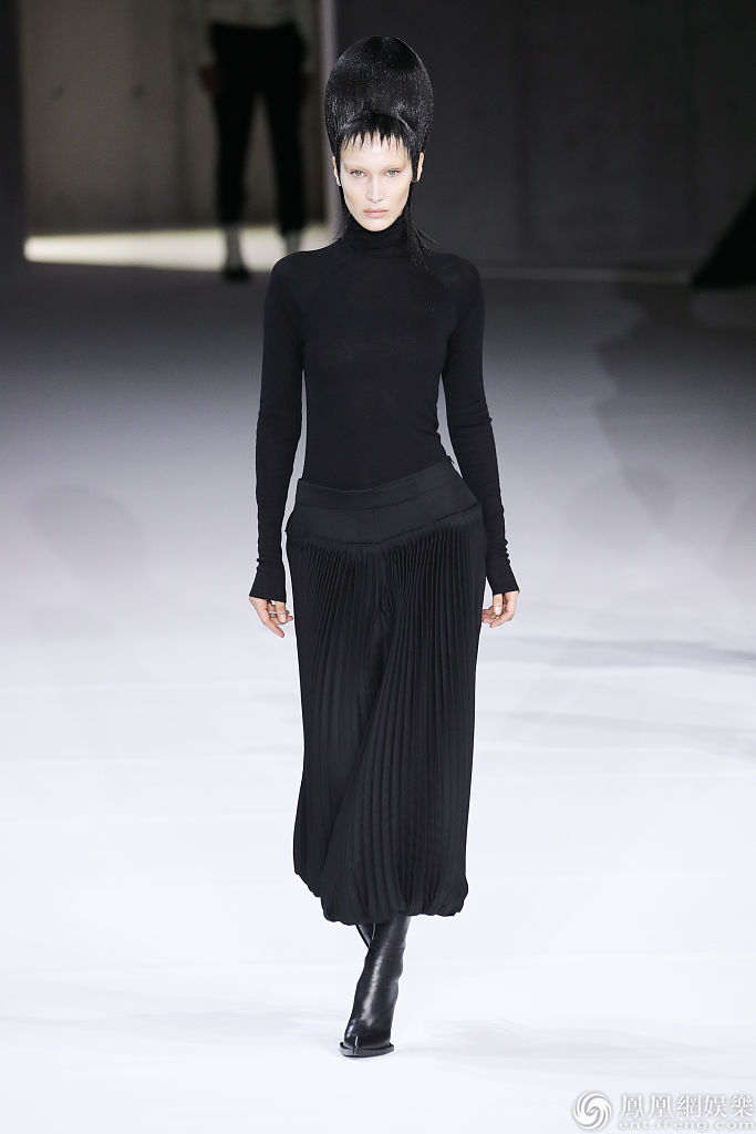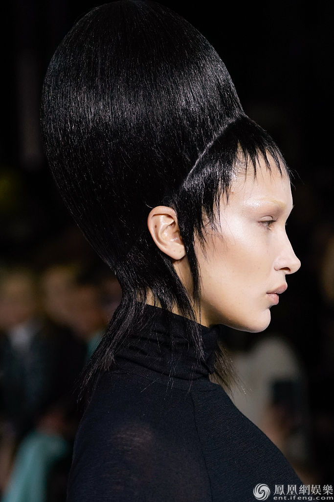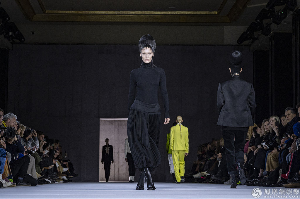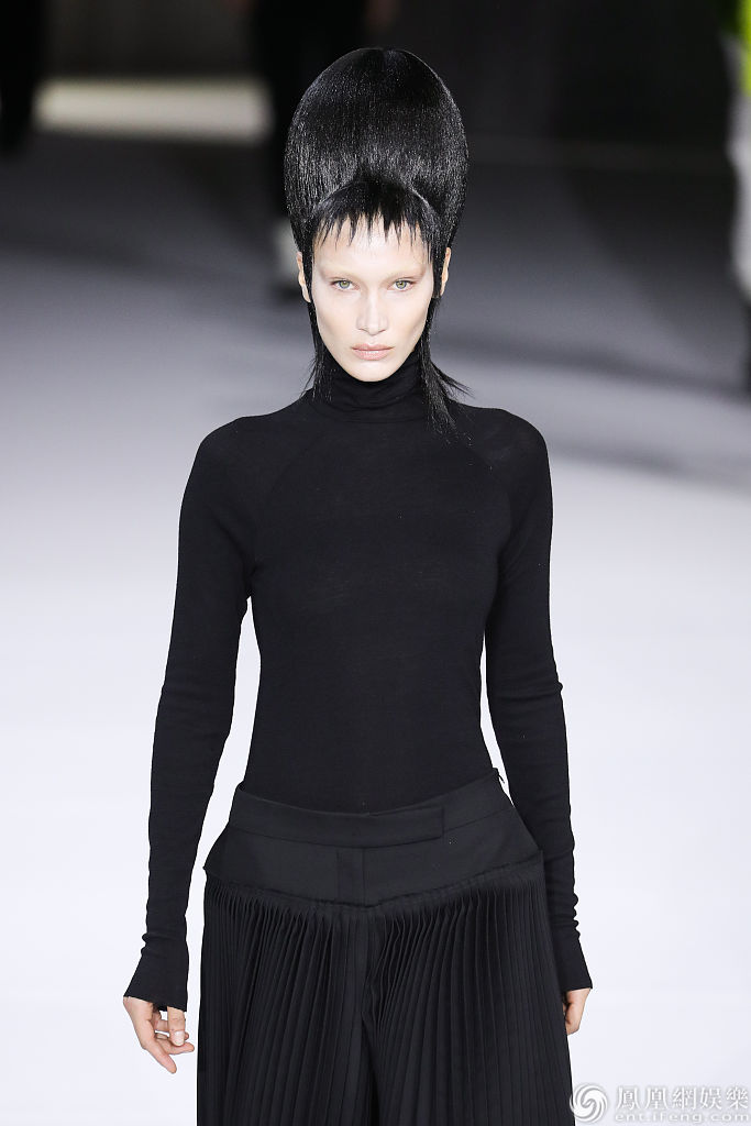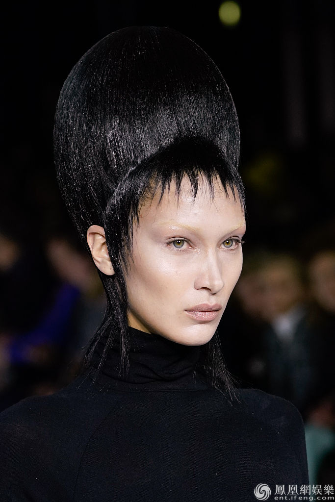 当地时间2020年2月29日,法国巴黎,2020秋冬巴黎时装周:Haider Ackermann 品牌秀场。贝拉·哈迪德(Bella Hadid)COSplay《沉睡魔咒》朱莉造型,身穿黑色高领衫和长裙, 高耸发髻+无眉妆容惊悚雷