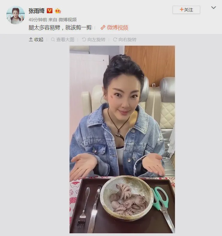 张还发了一段“愤怒地劈章鱼”的视频,其中包括在《美人鱼》中的角色。网民说这“太难了”。