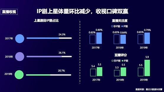 尽管这部电视剧越来越多地在头电视上播放,但2019年的整体爆炸式增长并未出现。2017年,2级作品中有3.9%将被破坏,2018年为1.9%,2019年仅为0.7%。更多作品被评为0.5%至1%,占31.9%。李鹏还强调,与非知识产权剧相比,知识产权剧具有更高的整体关注度,达到0.79%。口碑也更好,豆瓣的平均得分为5.9分。