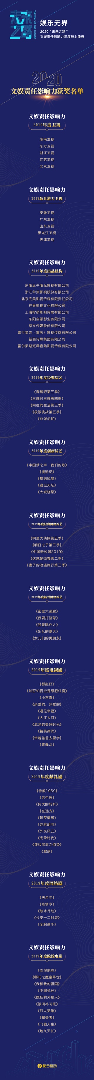 除了参与者的干货输出,今年的“娱乐无限——2020‘通向未来之路’娱乐责任影响年度在线仪式”也发布了“娱乐责任影响奖名单”。该奖项的评选基于无污染的酷云数据,并鼓励卫星电视、制片人和制片人在2019年为无数观众创作高质量的作品,并带来充分的情感。