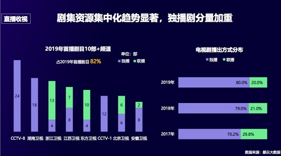 李鹏还用2019年内容市场表现的数据指出了几个关键点。戏剧资源集中化的趋势正在逐渐增强。目前,CCTV-1、CCTV-8、湖南卫视、浙江卫视、江苏卫视、东方卫视、北京卫视、安徽卫视占2019年首播剧目的82%,独唱剧目的比例从2017年的70.2%跃升至80%。
