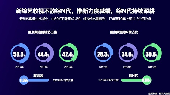 多样化开创了网络站联动的新局面。2019年,将有18个网络。除了爱幼登,西瓜录像带和蜂箱也加入了营地。然而,在2019年,卫星综艺节目的整体收视率并不好,2,63.3%的综艺节目的收视率不到0.5%。与新综艺节目相比,第n代综艺节目更受欢迎,平均收视率为0.65%,而新综艺节目的平均收视率仅为0.39%。