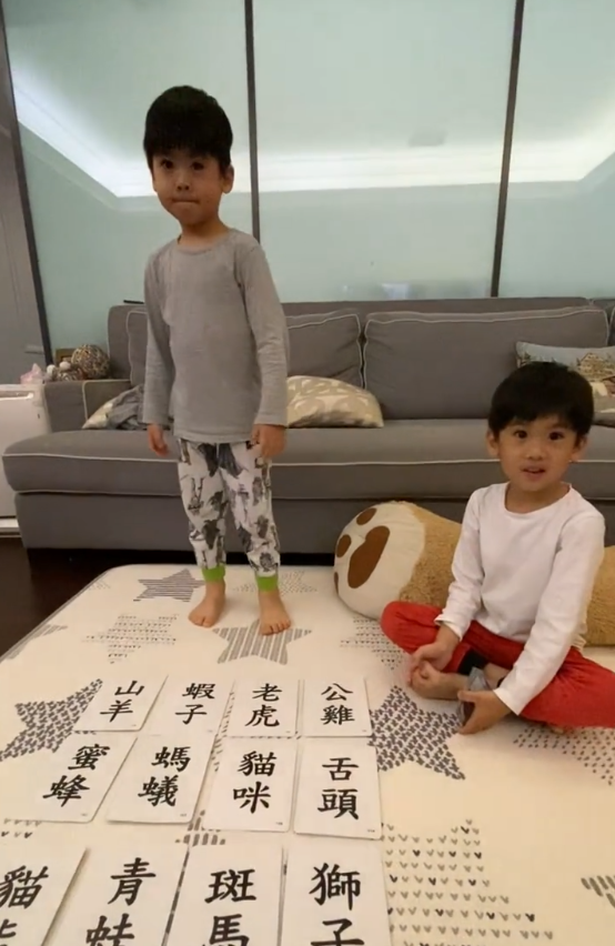 在视频中,写有不同动物的卡片被放在地板上,当双胞胎儿子的父亲指着他们的时候,他们会跑去接卡片。两兄弟迅速做出了反应。林志颖一指出问题就能回答,并且能模仿卡片上动物的叫声。然而,当林志颖提到“虾”的时候,他们错误地读了“蚂蚁”和“狮子”,这让林志颖笑了。在视频的最后,他们还以一种有趣的方式对每个人说“再见”,这很可爱。