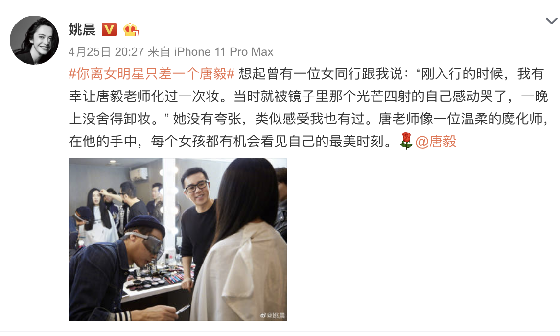 陈瑶分享了一位女同事的经历,“我记得一位女同事曾对我说:‘我刚开始事业时,有幸让唐逸先生化了一次妆。那时,我被镜子里光芒四射的自己感动得哭了,我不想整晚都卸妆。”他说,“唐老师就像一个温柔的魔法师。在他的手中,每个女孩都有机会看到她最美丽的时刻。"