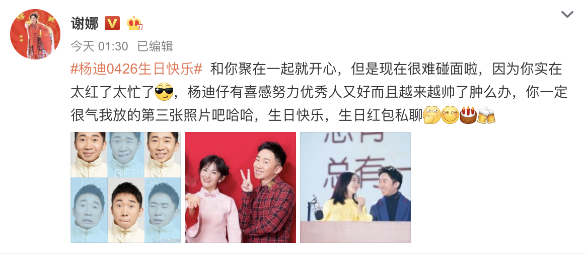 谢娜在他的文章中称赞杨迪“快乐、勤劳、优秀、善良、英俊”。他还发了生日贺卡,称之为“私人聊天的生日红包”。
