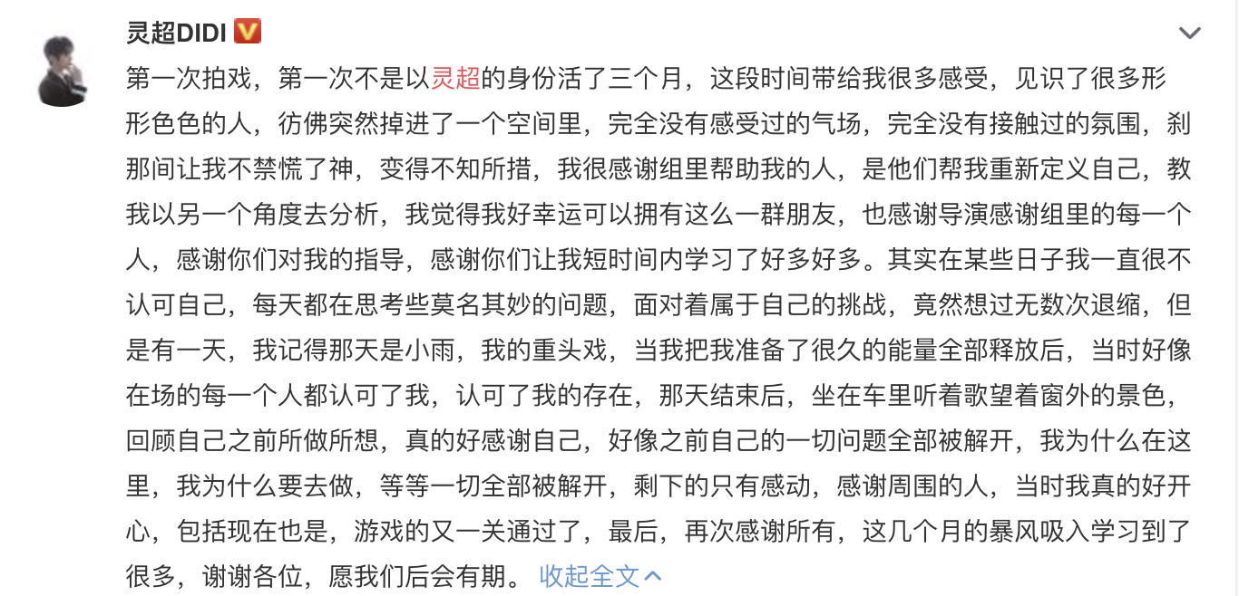 4月25日晚,凌超在社交媒体上发表了一篇关于他第一次拍摄经历的长篇文章。他说他很开心,就像比赛一样,并且通过了另一关。他也感谢一切,让他学到了很多。