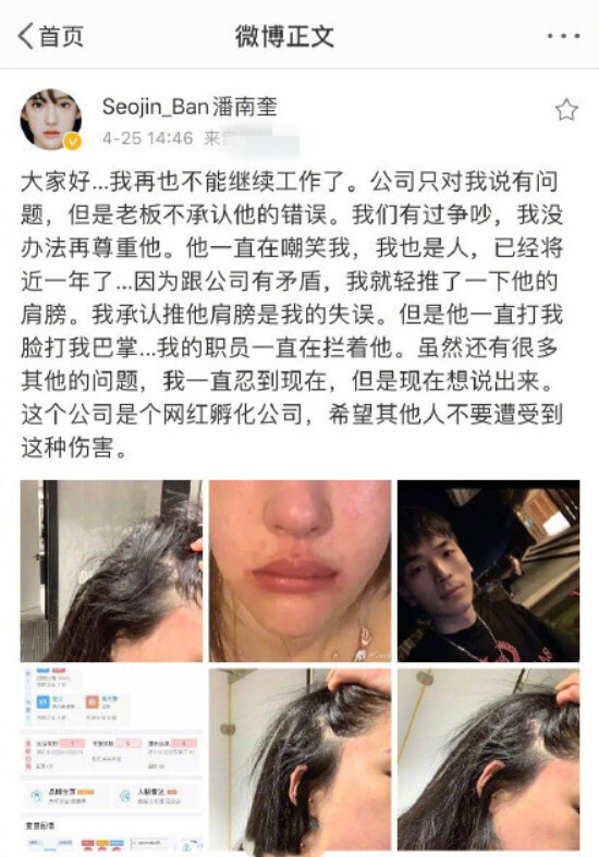 潘南奎25日突然贴出一张照片。因为他的冲突,他被老板狠狠地打了一顿。“我承认推他的肩膀是我的错误。但是他一直打我的脸,打我耳光...我的员工一直阻止他。”网友们甚至在照片中发现了潘南奎,甚至他的嘴都微微翘起,感叹道:"这位老板是个狠毒的人,一只手就打中了10亿韩元的脸。"然而,不知为什么,潘南奎很快就删除了这张照片,让外界充满了疑问,并怀疑潘南奎的账户可能被该公司控制。