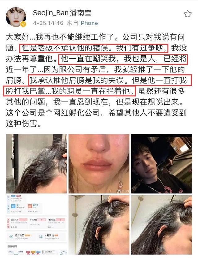 4月25日,网络红人潘南奎发布了他被公司老板殴打的消息,并有几张他的照片,但几秒钟后就删除了。