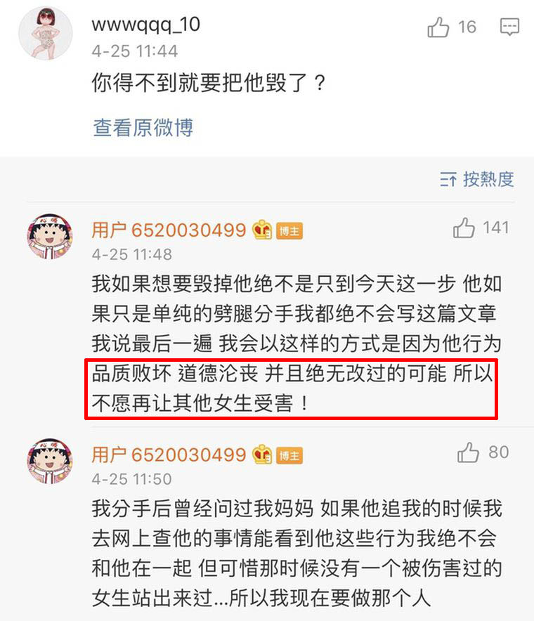 周扬青无情地称罗志祥“道德沦丧,没有改过的可能”。他还称罗志祥“不后悔”伤害了其他女孩,但没有人站出来指责她,所以现在她将成为“那个人”。