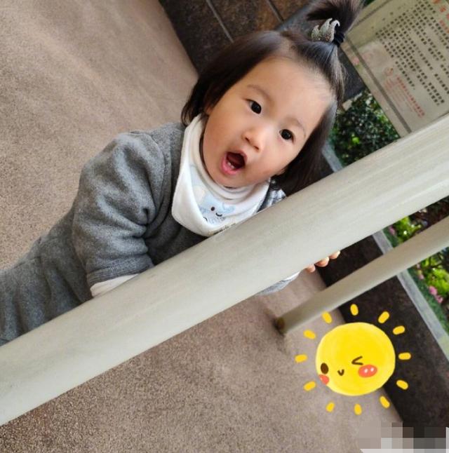 照片中的第三个儿子Xixi穿着一件灰色连衣裤,上面有一个小肚兜。挂在肚兜上的小铃铛让这套服装充满了可爱的感觉。一岁多的习习仍然不太稳定,一边看着镜头一边寻找平衡,多肉的小手正准备抓住身边的柱子,嘴巴张开,露出两颗小牙齿。