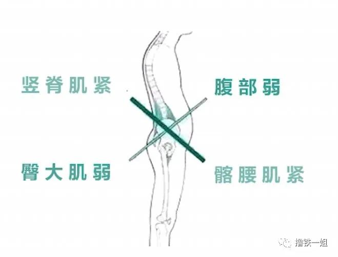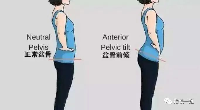 骨盆前倾是姐姐提到的一个非常常见的姿势问题。骨盆前倾是由于腹直肌和臀大肌无力,以及竖脊肌和髂骨过度紧张。