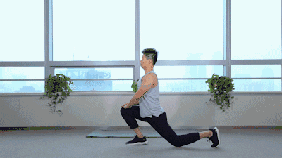 1.用你的后腿和膝盖在瑜伽垫上做一个大弓步。