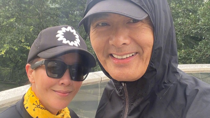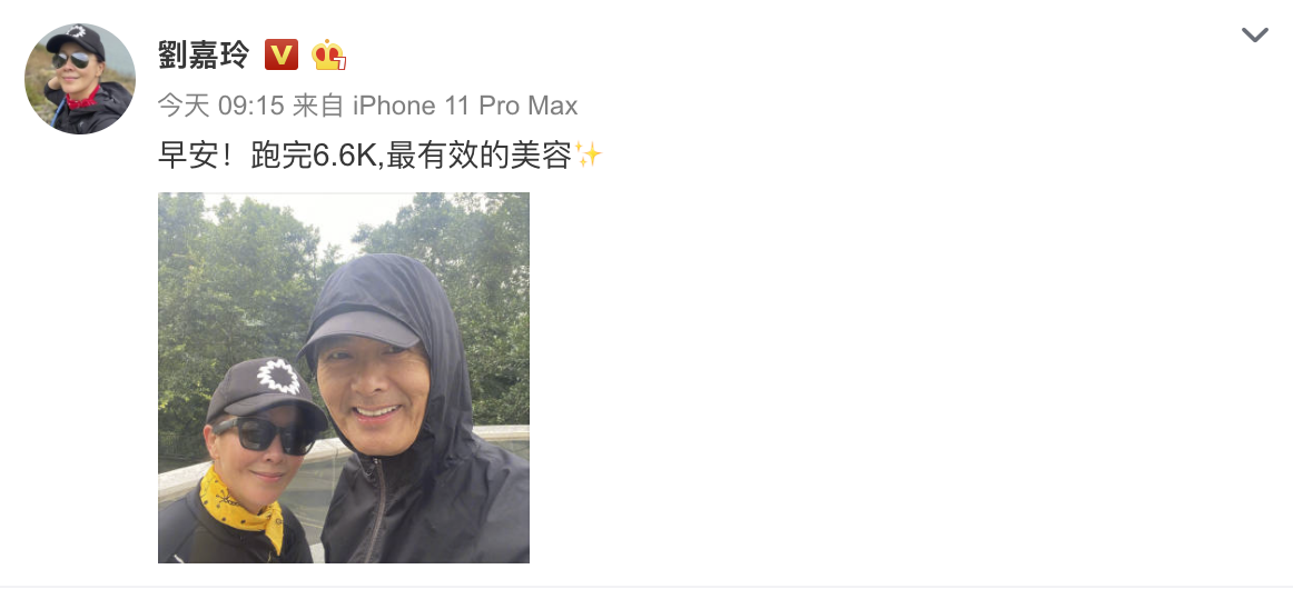 4月25日上午9点,刘嘉玲在社交平台上晨跑后与周润发合影,并写道:“早上好!跑6.6公里是最有效的美容方法。”照片中,两人戴着帽子,穿着运动服,面带微笑,身体状况良好。