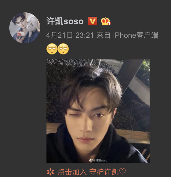 4月26日,许凯在社交媒体平台上发布了一天工作的照片,并在他的微博上发布了一条消息:“工作了一整天后,粉末粘在了他的脸上。”在自拍照中,许凯穿着牛仔外套坐在沙发上,露出他侧面的自画像。他的侧脸很瘦,轮廓分明,非常英俊,但他能隐约看到化妆的痕迹。
