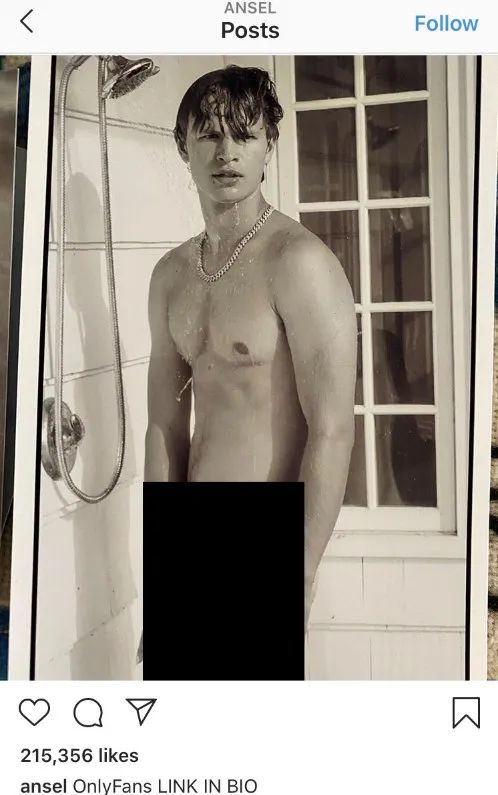 在《绝世盗车》中扮演这个男人的安塞尔·艾尔高特在社交平台上发布了一张他在户外洗澡的黑白裸照,并留下了一条信息。