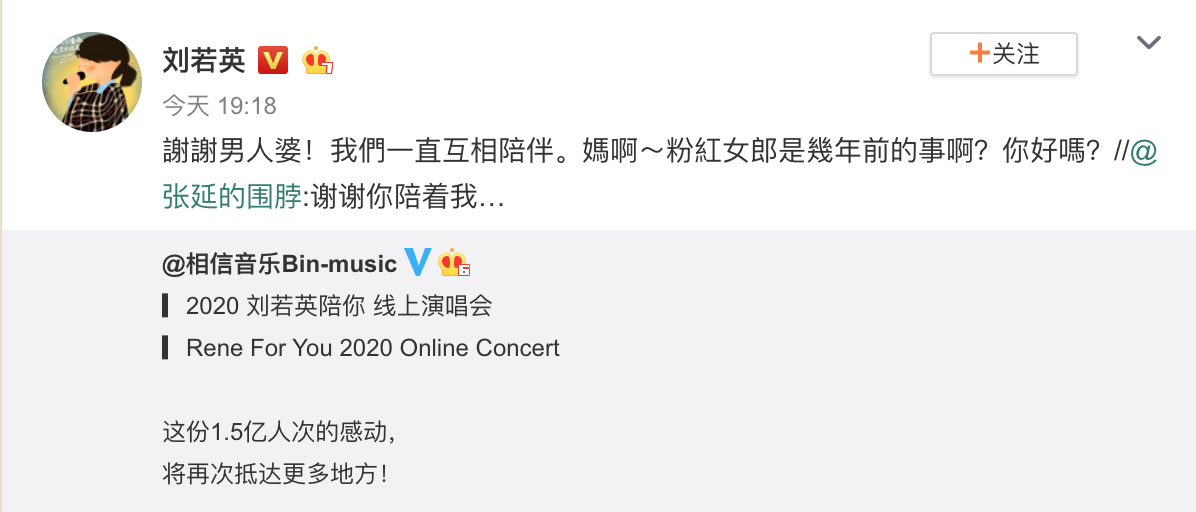 4月27日,在电视剧《粉红女郎》中饰演“男女人”何茹的张延转发了一条刘若英演唱会的微博,并大声喊道:“谢谢你和我在一起。”引起了一波网民的回忆和杀戮,