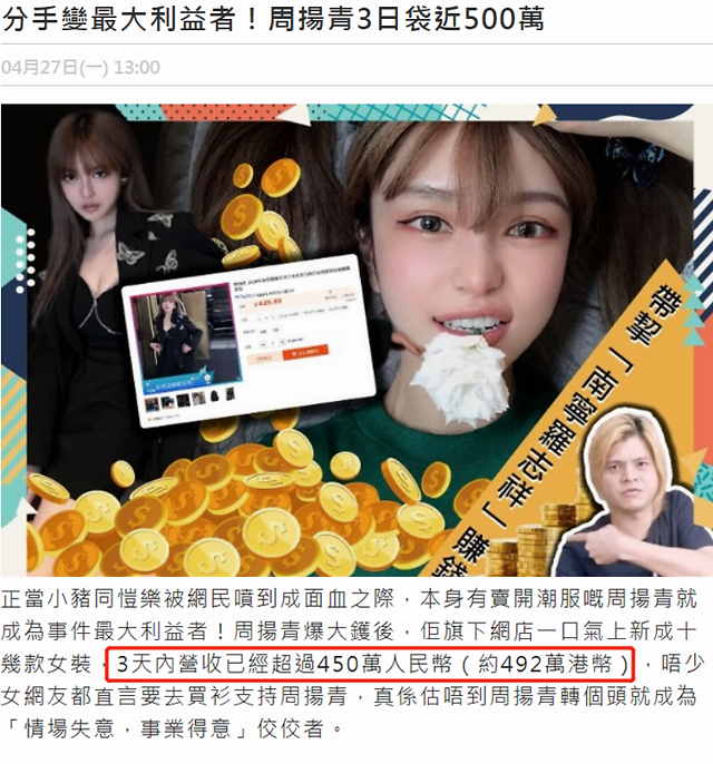 与罗志祥和凯勒的惨淡表现相比,周扬青可以说是丰收了。她不仅让渣男瞠目结舌,而且她的网上商店生意也蒸蒸日上。许多粉丝或路人支持周扬青的事业,让她在短短3天内就赚了近500万英镑。