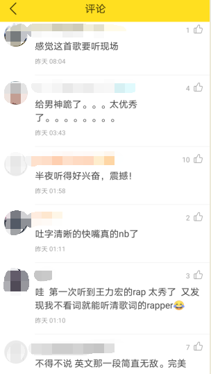 这位酷我音乐的网民也是如此陶醉,他们留言称自己的二哥为“向男神下跪,太好了”,“说唱歌手不用看歌词就能听到歌词”,“英语部分简直无敌”,还有一些婴儿被称为“地球英雄,爆发”。