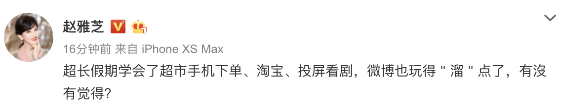 4月27日,赵雅芝在社交媒体平台上发布了一条帖子:“我学会了如何在超长假期里用超市手机下订单、清理宝藏和看电视节目。我的微博也有点“滑”。你这样认为吗?”她的语气很调皮,也很可爱。
