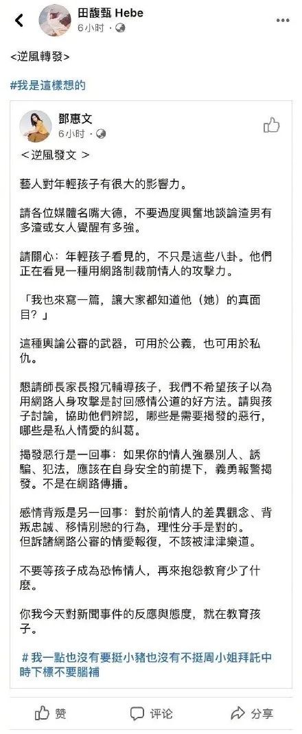 他转发了台湾心理学家邓会文的文章,并添加了# tag,我认为这样可以表达我的个人观点。