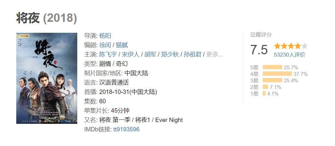 2018年,陈飞宇主演改编的同名小说《江一》,其中充满了猫腻,口碑终于略有提升。情节并不令人震惊,台词也很精彩。生产很好。豆瓣得了7.5分。