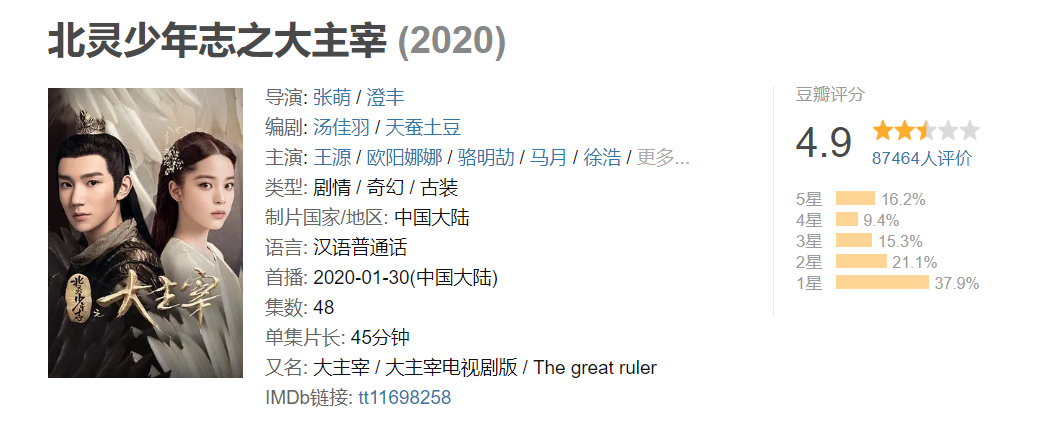 2020年,王源主演改编自天蚕土豆同名小说《大师豆瓣》,得分4.9分。