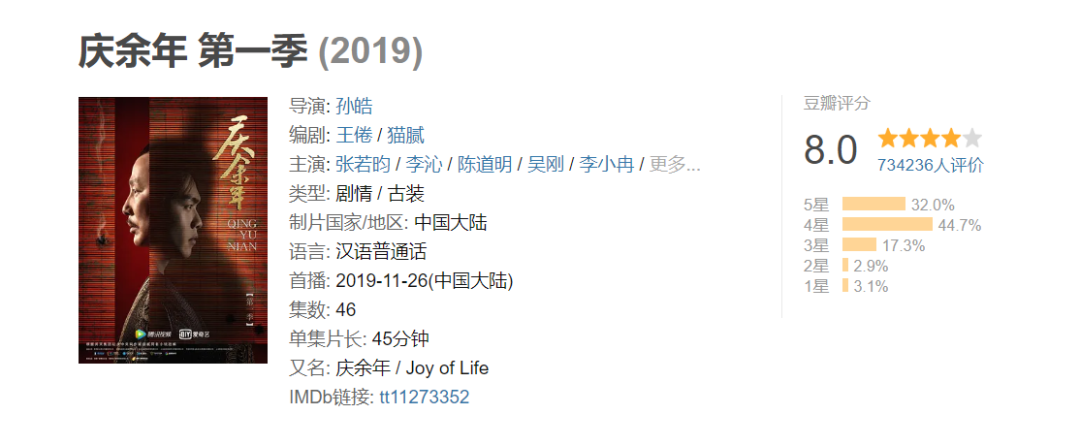 2019年,张若芸主演同名小说《庆余年》,豆瓣得了8分(得分人数超过了其他男性频率剧的总数),这是豆瓣唯一一部得分超过8分并成为爆炸性人物的男性频率剧。