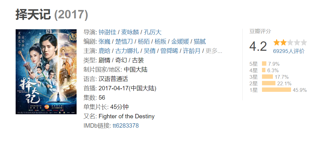 2017年,鹿晗主演了同名小说《天财记》,豆瓣得了4.2分。