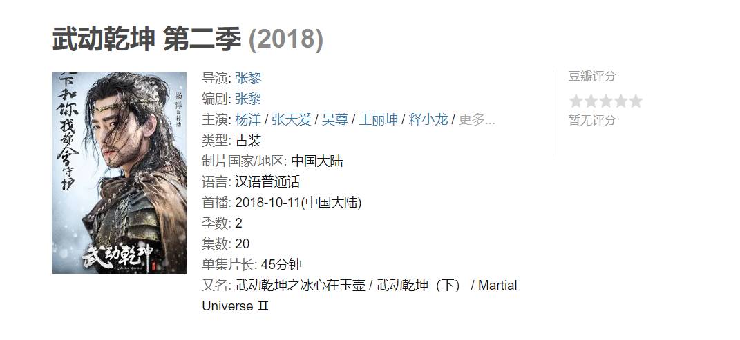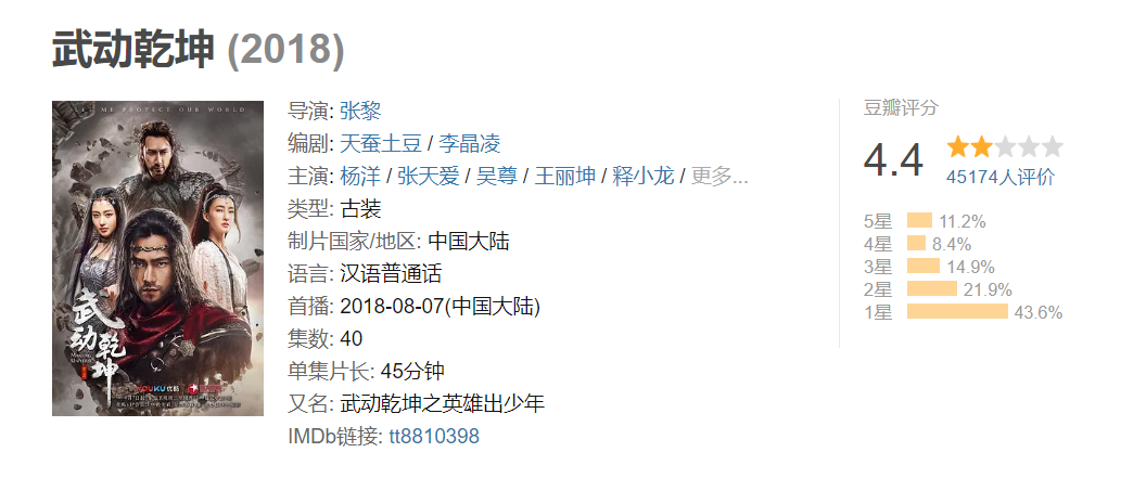 2018年,杨扬主演了天蚕土豆同名小说改编的《武东干坤》,豆瓣菜得了4.4分(第二部是2018年播出的,至今还没有得分);