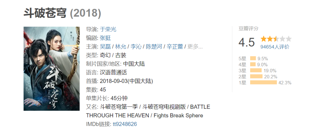 2018年,吴磊主演了根据天蚕土豆同名小说改编的《破空》,豆瓣得了4.5分。